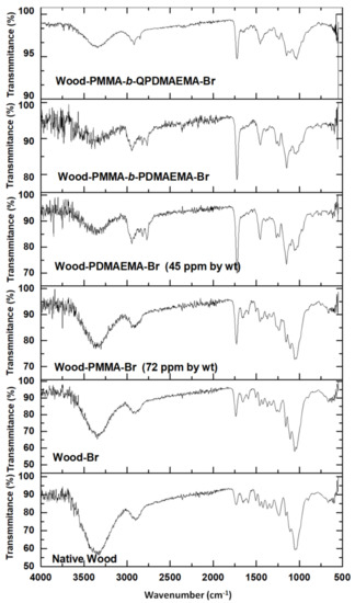 FT-IR spectra of native wood (untreated), wood esterified with ATRP initiator (wood-Br), and grafted with PMMA (wood-PMMA-Br), followed by polymerization the second PDMAEMA block (wood-PMMA-b-PDMAEMA-Br) and quaternization process (wood-PMMA-b-QPDMAEMA-Br).