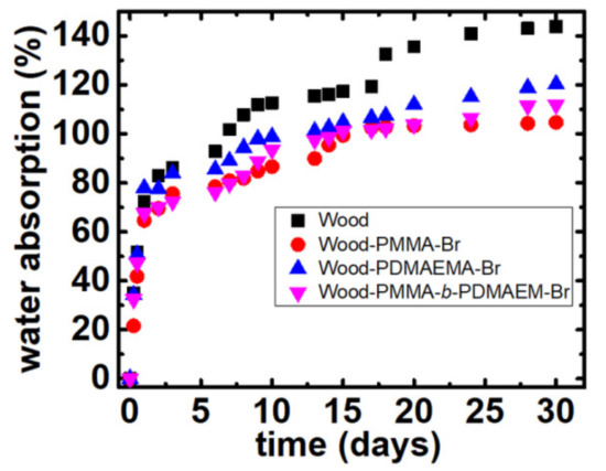 The PMMA modified wood showed reduced absorption properties, absorbing 22% and 105% water after 6 h and 30 days, respectively. The addition of the PDMAEMA polymer block increased the water uptake (32% after 6 h to 112% after 30 days). It is related to the attachment of a hydrophilic polymer brush block. Samples coated with PDMAEMA absorbed water slightly faster than PMMA modified wood–from 34% of water uptake after 6 h to 120% after 30 days.