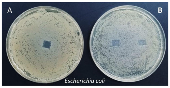Antibacterial activity identified by agar diffusion method of wood-QPDMAEMA (A) in comparison with unmodified wood (B) against Gram-negative Escherichia coli.
