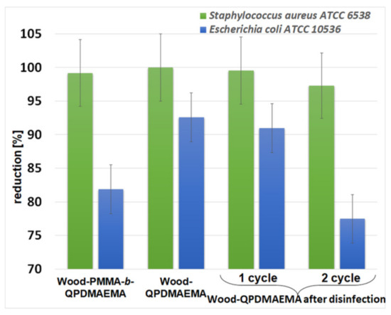 In order to evaluate the antibacterial effectiveness of wood-PMMA-b-QPDMAEMA-Br and wood-QPDMAEMA-Br exposed to washing and decontamination, two cycles of disinfection were carried out. Each cycle consisted of 30 min soaking of wood block in 70% ethanol, air drying, and UV sterilization (all activities were carried out under Laminar Flow Cabinet ESCO Airstream in order to ensure aseptic conditions). After each cycle, the antibacterial activity assays of wood-PMMA-b-QPDMAEMA-Br, wood-QPDMAEMA-Br, and control wood were repeated.