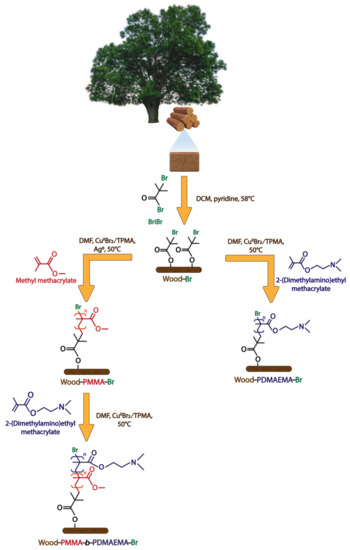 A two-step synthetic route for the preparation of a wood–polymer composite. Abbreviations: Ag0—sliver wire, BriBBr—2-bromoisobutyryl bromide, CuIIBr2/TPMA—catalytic complex, DCM—dichloromethane, TPMA—tris(2-pyridylmethyl)amine), wood-Br—brominated wood, wood-PMMA-Br—wood grafted with PMMA, wood-PMMA-b-PDMAEMA-Br—wood grafted with block copolymer composed of PMMA and PDMAEMA.
