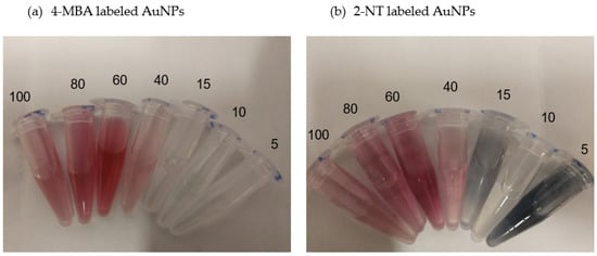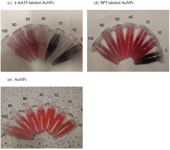 Solutions of AuNPs labeled with (a) 4-MBA, (b) 2-NT, (c) 4-AATP, (d) BPT, and (e) unlabeled AuNPs. Numbers indicate the particle size. Dark solutions in (b–d) denote aggregation for small-sized NPs, 15 nm and 5 nm.