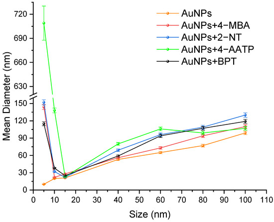 Figure 4 illustrate the results of DLS measurements of all AuNP solutions. The measured particle sizes essentially reproduce the nominal sizes of AuNPs. The mean diameter of 5 nm AuNps+4-MBA was measured to be 150 nm. In contrast, the particle sizes are more significant in the presence of a label, especially with 2-NT and BPT labels that have two benzene rings. Considering the AuNPs+4-MBA, the sample is transparent at a size of 5 nm as observed through the naked eye. However, there is the chance of a decreased concentration of gold nanoparticles because of a certain degree of aggregation in some of the samples.