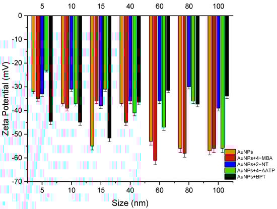 Zeta potential of (orange) bare AuNPs, and in the presence of a label: (red) 4-MBA, (blue) 2-NT, (green) 4-AATP, and (black) BPT for different NP sizes. Error bars: standard deviation.