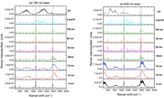 Raman spectra of 4-AATP labeled AuNP solutions measured at (a) 785 nm and (b) 830 nm.
