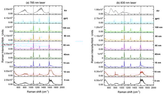 Raman spectra of BPT labeled AuNP solutions measured at (a) 785 nm and (b) 830 nm. Dashed lines denote the two most prominent signals of BPT at 1080 and 1586 cm−1. Shading: standard deviation.