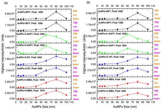 As it can be seen from Figure 6, Figure 7 and Figure 8, weak or no signal was observed for labeled AuNPs of sizes smaller than 15 nm. The large signal sometimes observed for 5 nm nanoparticles labeled with 2-NT or 4-AATP could be due to aggregation [23]. Conversely, the signal was strong for AuNPs of size comprised between 40 nm and 100 nm, as shown in Figure 9.