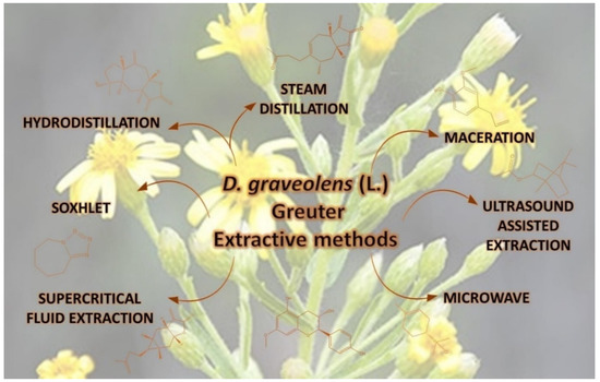 D. graveolens is a strongly aromatic species, and its essential oil, known as “odorous Inula” or “odorous Dittrichia”, is widely used in phytotherapy or industries in the production of perfumes, soaps, and toiletries [10,11]. Moreover, numerous studies have investigated the essential oil chemical composition (Table S1) [11]. In particular, until now, thin-layer chromatography (TLC) [12], fractionation with Sephadex and silica gel columns [13,14,15,16,17], nuclear magnetic resonance (NMR) [18], electron ionization mass spectroscopy (EIMS) [17], high-performance liquid chromatography (HPLC) [11], and associated techniques, like gas chromatography-mass spectrometer (GC-MS) [10,19,20,21,22,23,24,25,26,27,28,29,30,31], liquid chromatography-mass spectrometry (LC-MS) [32], and gas chromatograph-flame ionization detection (GC-FID) [28] have been used to investigate the active molecules of D. graveolens. These methods have been applied after extracting the vegetal material, which was principally made using distillation, Soxhlet, maceration, microwave, ultrasound-assisted extraction, and supercritical fluid extraction techniques [11,25,31,33] (Figure 2).