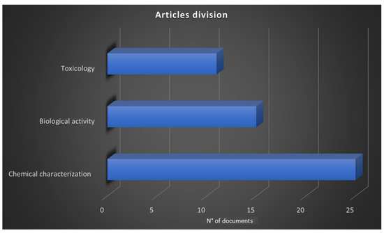 This study aims to review all the metabolites and biological activities of D. graveolens reported in the literature until October 2021. This review included articles found on two specific databases: Scopus and PubMed. Only English articles containing the selected keywords (Inula graveolens and Dittrichia graveolens) were detected, while the unavailable full texts were not requested. The initial selection provided 85 articles, of which 68 were found in Scopus and 17 on PubMed. Among the 85 articles, 52 were relevant to the research topic. All selected articles were carefully analyzed and divided by argument (chemical characterization, biological activity, toxicology), as shown in Figure 4.
