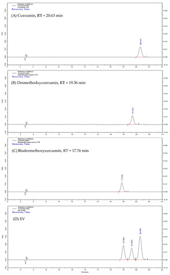HPLC fingerprint of standard curcumin (A); standard desmethoxycurcumin (B); standard bisdesmethoxycurcumin (C); and turmeric rhizome ethanol extract (EV, (D)).