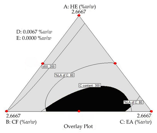 Overlay plot. Black area = the optimal region; A = HE; B = CF; C = EA; D = external curcumin; and E = sodium hyaluronate (NaHA). Lines represent the TE-NPs formulations with minimum and maximum dependent variable values according to the acceptance limit. The spots (🔴) represent the design points.
