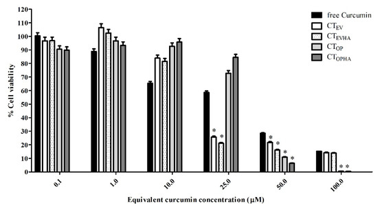 The cytotoxicity of TE-NPs compared with free curcumin is shown in Table 4 and Figure 5. It was found that free curcumin and four TE-NPs exhibited a cytotoxicity effect on the human hepatoma HepG2 cells. The IC50 values were 43, 40, 37, 41, and 42 μM for free curcumin, CTEV, CTEVHA, CTOP, and CTOPHA, respectively. Although, the IC50 values for TE-NPs were shown to be slightly lower than those of free curcumin, all TE-NPs formulations showed a significantly stronger inhibition effect than free curcumin at the equivalent curcumin concentrations of 50–100 µM (p-value < 0.05). The higher inhibition effect of TE-NPs might be due to other compositions contained in the turmeric rhizome in addition to curcumin. These compositions were DCM, BDCM, and turmerone compounds [6,7,9]. Ethanol was also reported to have inhibition effect on HepG2 cells, with an IC50 value of 3.13 %v/v [68,69,70,71,72]. In this experiment, ethanol concentrations of TE-NPs samples were in the range of 0.001–1.518 %v/v (for CTEV and CTEVHA) and 0.001–0.983 %v/v (for CTOP and CTOPHA), depending on the equivalent curcumin concentration in each formulation. These maximum levels of ethanol contained in TE-NPs samples were 2–3 times lower than IC50. Therefore, it can be assumed that ethanol has a negligible inhibition effect on HepG2 cells. In addition, it was shown that the treatment using the developed optimal formulations (CTOP, and CTOPHA) at equivalent curcumin concentration of 50–100 µM inhibited the proliferation of HepG2 better than CTEV and CTEVHA (p value < 0.05).