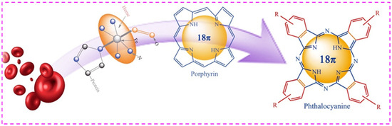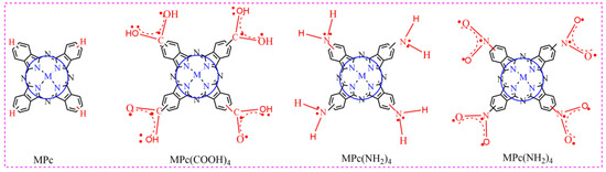 Metal-N4-chelate compound is one of numerous metal macrocycles. Metalloporphyrin (MPs) and metallophthalocyanine (MPcs) with metal-N4-chelate structure have an 18 π electrons conjugated structure and have the function of biomimetic oxygen carrier resembling hemeproteins in the human body [9] (Figure 1). Compared with MPs, a variety of substituents can modify with the periphery of the benzene ring of phthalocyanines, and different substituents can make MPcs have different chemical structures and properties [10,11,12]. The catalytic activity of the metal-N4-chelate macrocycles is affected by the chemical properties of the ligand field and the central metal ion. Owing to the π electron conjugated structure of the metal-N4-chelates, delocalization effect and weakly bonding properties, metal-N4-chelate compounds are more easily oxidized and reduced. A phthalocyanine ring is a cyclic rotaene chromophore with 18 π electrons. The p–π conjugation of substituent and phthalocyanine ring influences the electron cloud density distribution of the system and catalytic activity. For MPcs with strong ligand-field effects, the chemical structure of the phthalocyanine, the radius and the d-filling of the metal center ions are the main factors that influence catalytic activity [13]. Furthermore, the existence of electronegative substituents extremely reinforced the catalytic activity of the phthalocyanines. Their catalytic activity is reinforced by the numerous electron-withdrawing substituents on the periphery of metal Pcs [14]. The results stated clearly that the revision of the main MPcs skeleton enhanced catalytic performance and encouraged us to design a phthalocyanine compound with different substituents. In this paper, the metallophthalocyanines ZnPc, ZnPc(COOH)4, ZnPc(NH2)4 and ZnPc(NO2)4, which have the same central metal ion and different electron-withdrawing substituents, were prepared to study the influence of chemical structure on oxidative desulfurization. At the same time, the phthalocyanine molecules themselves do not have catalytic oxidation activity. Metallophthalocyanines have excellent catalytic performance when the phthalocyanine molecules are coordinated with the metal ions to form phthalocyanine complexes. Therefore, the type of central metal ions is also the key factor affecting the catalytic activity of phthalocyanine complexes.