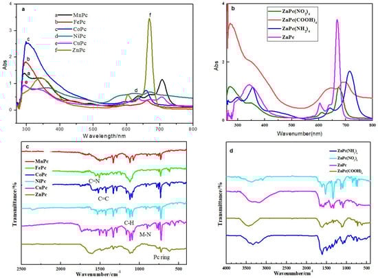 UV-Vis and FTIR spectra of MPcR4 compounds. (a,b): UV-Vis spectra of MPcR4; (c,d): FTIR spectra of MPcR4.