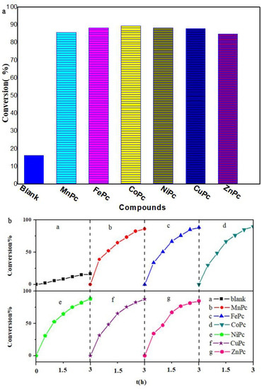 The influence of center metal ion of phthalocyanine. (a) desulfurization activities of phthalocyanine; (b) desulfurization activities at different time.