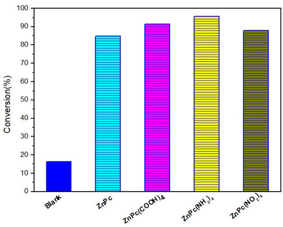 In addition, the nature of the substituents on the phthalocyanine ring strongly affects the catalytic oxidation desulfurization activity of the MN4-type conjugation system (Figure 6). The desulfurization activity is in order of ZnPc < ZnPc(NO2)4 < ZnPc(COOH)4 < ZnPc(NH2)4. The activity of the different substituted phthalocyanine complexes is shown in Figure 7. The results show that inductive effect and p–π conjugation effect of four R substituents are another main factor affecting the electron cloud density distribution of metal phthalocyanine and its catalytic performance. The phthalocyanine ring is a cyclic rotaene chromophore with 18 π electrons. Due to the delocalized and weakly bound character of π electron clouds, the conjugated compounds with relatively high π electron density can be oxidized and reduced relatively easily [29,30]. Considering the same central metals, the π electron density of MPcR4 is higher than that of MPcs because of the p–π conjugate effects of four R substituents (Figure 6). The p–π conjugate effects are benefits for the activation process of O2. The electron cloud density of ZnPc < ZnPc(NO2)4 < ZnPc(COOH)4 < ZnPc(NH2)4 system increases sequentially with the increase in inductive effect and p–π conjugation effect. The higher electron cloud density is conducive to transfer an electron from phthalocyanine to the oxygen molecule, and the catalytic oxidative desulfurization activity of phthalocyanine complexes increased sequentially.