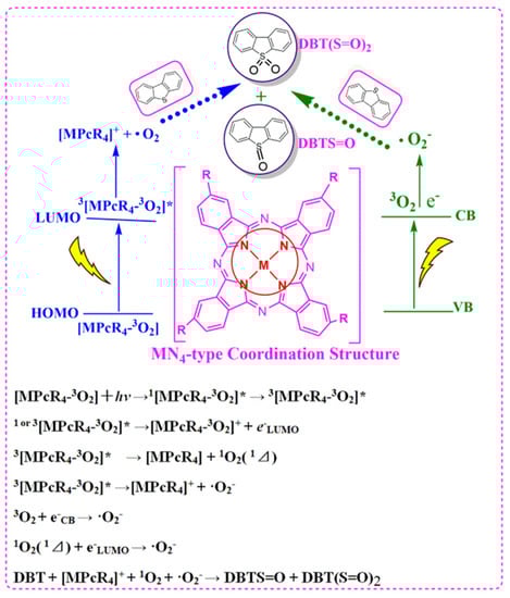The catalytic oxidative desulfurization activity of phthalocyanine complexes was studied taking an O2 molecule as oxidant and dibenzothiophene as simulated sulfur pollutant. The maximum removal rate of dibenzothiophene reached 96.46% after reacting for 180 min at 60 °C. The reaction mechanism for oxidative desulfurization is shown in Figure 8. Under natural light irradiation, the singlet phthalocyanine complexes [MPcR4-3O2] were excited to form triplet excited state 3[MPcR4-3O2]*; 3[MPcR4-3O2]* triplet excited state phthalocyanine interacts with triplet ground state oxygen molecule 3O2 to conduct energy transfer and generate singlet oxygen molecule 1O2. The active intermediates *O2-MPcR4+ formed strong activity oxidants [MPcR4]+ and O2, which converted DBT to sulfuric acid radical ion and sulphone. The quantum yield of the photocatalytic redox process increased as a result of the additional formation of oxidants [MPcR4]+ and O2 [16].