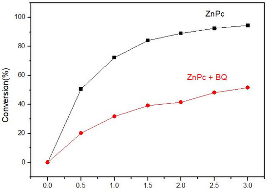 Radical trapping experiments were designed to reveal the active oxygen species •O2− on the photocatalysis process through using appropriate quenchers p-benzoquinone(BQ). The obtained results are shown in Figure 9. The dramatic decline from 94.42% to 51.61% of DBT removal is achieved with the addition of 1mM BQ. The results suggest that •O2 is the main active species for DBT degradation under visible light irradiation. Additionally, photostability of the catalysts is a major property for their practical application. DBT degradation was performed to test the reusability of MPc. The reaction was cooled to room temperature before being filtered off. After being separated, the catalysts were washed with distilled water for 3 times and dried at 100 °C under vacuum. The obtained results are shown in Figure 10. Although there is a decrease in the degradation ratio for each photocatalyst, more than 93.98% of dibenzothiophene can be degraded in the second circle. To further investigate the reusability of MPcs, DBT degradation was performed five times. The catalysts of ZnPc could be used at least five times with only a 10% change. The results indicate that the MPcs compounds processed high stability.