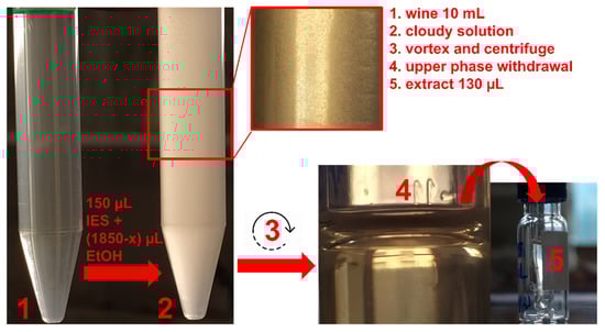 Scheme of the DLLME procedure on wine sample with a certain alcoholic content (x μL of ethanol).