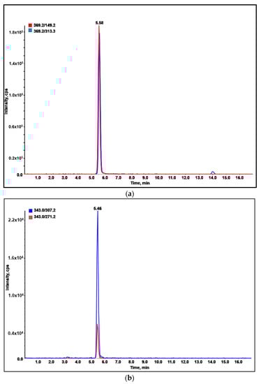 The quantitative analysis results on eleven commercial wines are reported in Table 4. Only in one biological white wine were the target compounds not detectable or present at concentration lower than the LOD/LOQ of the method. This applied also for most of the compounds in the other samples, in which the more frequently detected and abundant analytes were methoxyfenozide (Figure 3a) and boscalid (Figure 3b). However, all the analyzed samples were in compliance with the European regulation, since the concentrations of the detected pesticides were far below the MRLs.