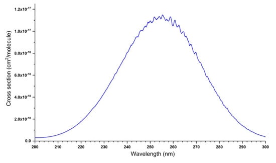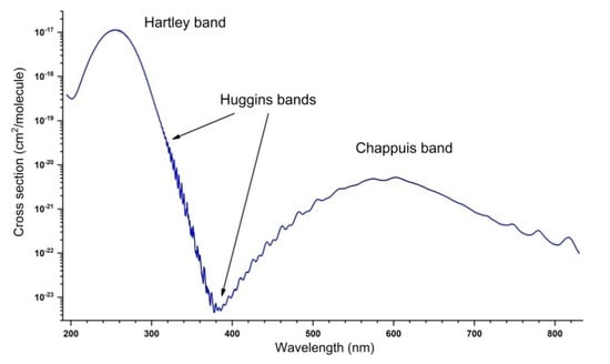 The ozone molecule absorbs in most of the spectral regions, from microwave to UV. This feature makes it possible to observe and quantify it, particularly in the infrared range (mainly 10 and 5 microns) and in the UV, in the Hartley band (centered at 255 nm). Other wavelengths corresponding to the Huggins bands near 340 nm or Chappuis bands in the visible region around 610 nm, are also used, but to a lesser extent. Figure 1, Figure 2 and Figure 3 show an overview shape of the absorption cross-sections in the UV and visible ranges. The cross section in Figure 1 is plotted in a logarithmic scale. A large number of publications, documents, and reports recall the main features of these absorption properties [,,,,,,,,,,]. The Hartley band, corresponding to the largest absorption coefficient, is often used, particularly in Dobson spectrometers, and now on various satellites with TOMS [] as a precursor. The room-temperature absorption cross-sections of O3 in the Hartley band at 253.65 nm (in 10−20 cm2/molecule units), measured in various studies, are given in Table 1.