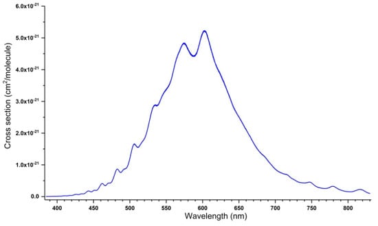 Figure 1, Figure 2 and Figure 3 show the absorption cross-section between 195 and 830 nm at T = 295 K. The data correspond to the spectra recorded by J. Malicet, J. Brion, and D. Daumont in the Groupe de Spectrométrie Moléculaire et Atmosphérique (GSMA) at the University of Reims in the 1970s, using a Jobin-Yvon monochromator, working at a resolution of 0.01 nm, and are provided here as private communication. In addition to the spectrum shown in Figure 1, Figure 2 and Figure 3, these researchers recorded UV spectra at temperatures of 218, 228, 243, and 273 K. The reader can find these spectra in the S&MPO database [] at https://smpo.iao.ru/xsections (since 1 May 2005). More detailed information is given in [,,,,,,,].