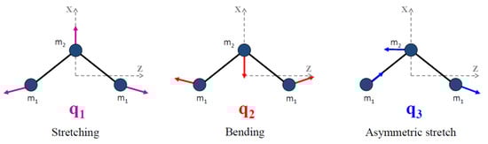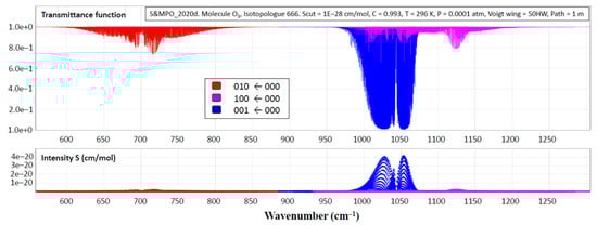 In the open geometrical configuration of the electronic ground state, the ozone molecule is an asymmetric top with three vibrational modes. The corresponding fundamental band origins are 701, 1042, and 1103 cm−1. The wavenumbers 701 cm−1and 1103 cm−1correspond to symmetric normal modes q2 and q1, respectively, bending and stretching vibrations. The wavenumber 1042 cm−1corresponds to the asymmetric stretching mode q3 (see Figure 4). The vibration states of the molecule are usually labeled by the set of three quantum numbers (V1V2V3), corresponding to the excitation of three normal mode vibrations. The observed spectrum in the infrared region (up to dissociation of about 8500 cm−1) corresponds to transitions between various vibration–rotation (VR) states in the electronic ground state. Each vibrational band possesses a rotational structure consisting of hundreds or even thousands of individual VR lines. Transmittance functions for the ozone fundamental bands simulated in S&MPO are shown in Figure 5. These rotational patterns are increasingly complex at a high energy range because of the coupling between various modes. Depending on the intensity cut-off, vibrational bands cover ranges of several tens to hundreds of wave numbers.