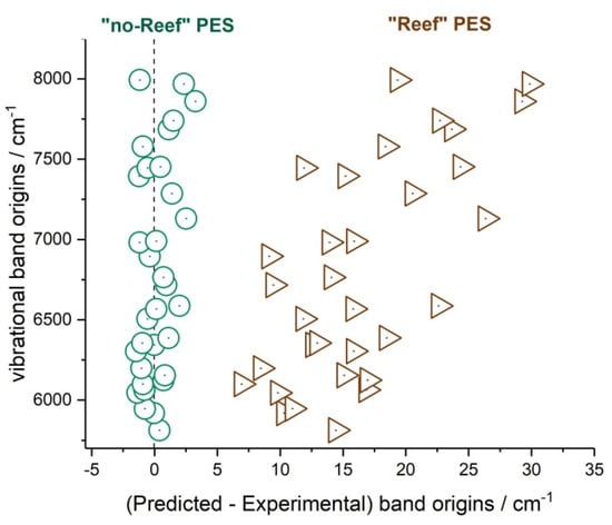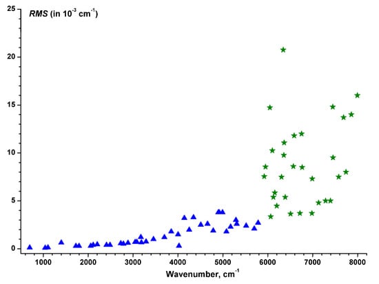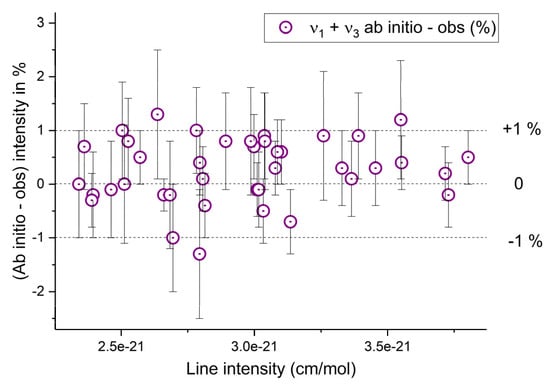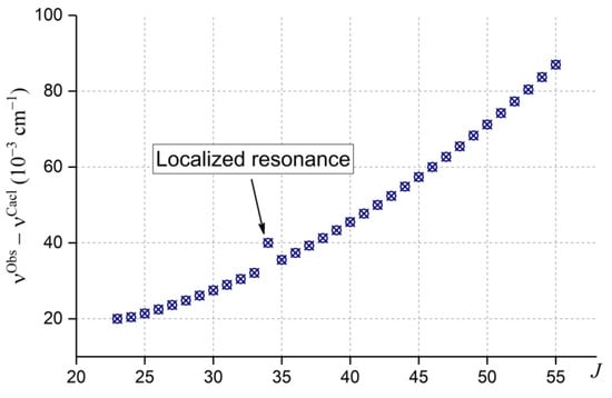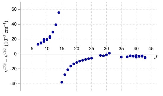 The spectrum assignment procedure is based on the ground state combination differences (GSCD) explained in a simplified way in the Figure 6. As a rule, the rotational structure of the ground vibrational state (000) is well known, thanks to microwave measurements, the experimental accuracy of which is three orders of magnitude higher than those of typical infrared measurements. As a result, line positions of the transitions reaching the same upper energy level in different branches have precisely the same shift with respect to any (even incorrect) calculation, as shown in Figure 6. Then, the curve (νObs − νCalc), as a function of J for a certain Ka value, will be similar to the plot of Figure 6. Note that the differences (νObs − νCalc) of Figure 6 are given to explain the identification procedure and do not correspond to the real calculation of a certain band. The “ASSIGN” code [], based on GSCD, has been written to find this type of curve in real spectra and specific calculations.