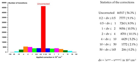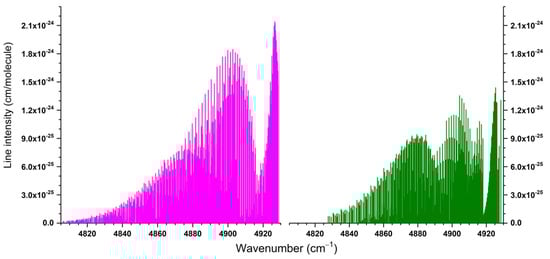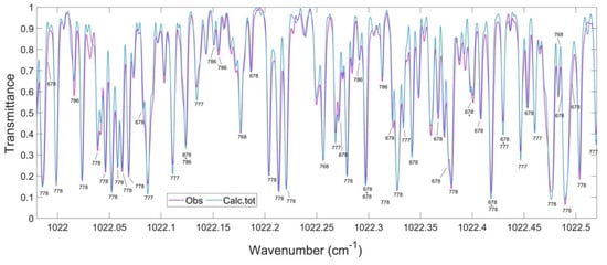 The second method of rotational assignment of experimental spectra is the use of synthetic spectra. These spectra are plotted using calculated lists of frequencies and intensities of VR transitions and are directly compared with the observed spectra. For these purposes, we use the MultiFit code developed in the GSMA laboratory []. This method has proven its high efficiency, particularly for the assignments of A-type bands in high wavenumber ranges (see Section 4.4. Results).
