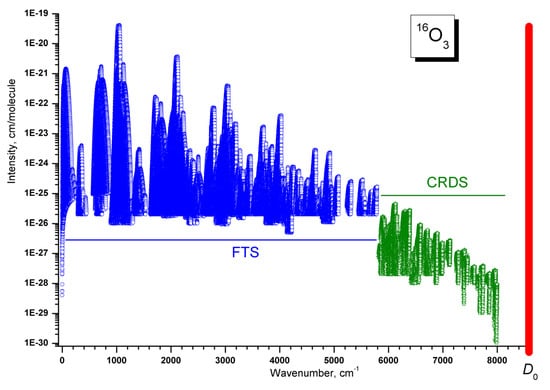 - Mikhailenko, S.; Barbe, A.; Tyuterev, V.G. Extended analysis of line positions and intensities of ozone bands in the 2900–3400 cm−1 region. J. Mol. Spectrosc. 2002, 215, 29–41. [Google Scholar] [CrossRef]