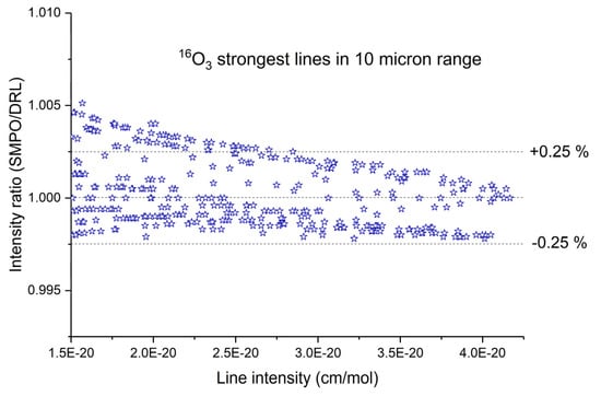 The most recent work [] recommends the use of the UV reference cross-section value 1123.9 × 10−20 cm2/molecule at the wavelength 253.65 nm. This new value is used to validate the absorption coefficient in the infrared region (see next Section). The goal of the atmospheric community is to achieve a consistency between absorption intensity values better than 1% for various spectral ranges, in particular for the 10 microns and Hartley bands (most often used for retrievals), but they must also be compatible in both ranges. That was clearly not the case until recently [,,,].