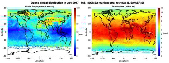 These observations in the stratosphere are also performed by ground-based measurements, such as the Dobson spectrophotometer [], and more recently by satellites [,,,,,,], which cover almost the entire Earth and monitor ozone evolution.