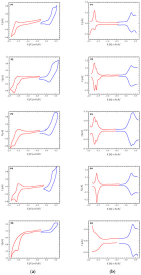 Redox properties of conjugated polymers are of crucial importance for their electrochemical and electronic applications. For these reasons, cyclic voltammetry (CV) and differential pulse voltammetry (DPV) are routinely used for the characterization of new conjugated polymers and for the determination of their ionization potential (IP) and electron affinity (EA). In Figure 3, cyclic voltammograms of P1–P5 are presented, whereas the determined redox potentials are collected in Table 2.
