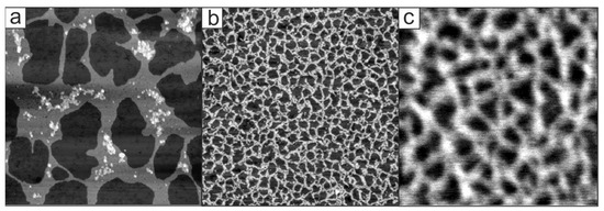 As already stated, the main chain of P4 is the same as that of P5. The only difference between these polymers is the presence of the permanent dipole-bearing group (1-methyl-2-phenyl imidazole) fused with the phenylene ring of the main chain in the case of P4. The presence of this dipole results in the distinctly different supramolecular aggregation patterns of this polymer. The first dissimilarity concerns the selection of the solvent for thin layer deposition. In the case of P4, chloroform has to be used for casting. It is, therefore, tempting to compare the topologies of the monolayers of P4 and P5, deposited from chloroform, in the same conditions. Chloroform is more polar than chlorobenzene, and the effect of this higher polarity additionally increases the effect of intermolecular interactions in the case of P5. As a consequence, the monolayer of P5, deposited from this solvent, is characterized by randomly distributed larger areas of very tightly packed macromolecules (Figure 5a). More polar P4, on the other hand, forms, in the same conditions, a homogeneous network of loosely packed macromolecules (Figure 5b,c). The resulting mesh is characterized by much larger distances between adjacent molecules (approx. 110–160 nm).