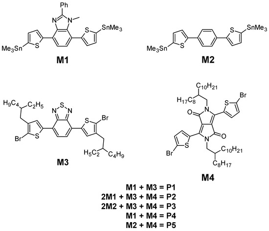 Detailed procedures of the synthesis of the prepared monomers (M1–M4) and polymers (P1–P5) can be found in the supplementary materials. This involves: