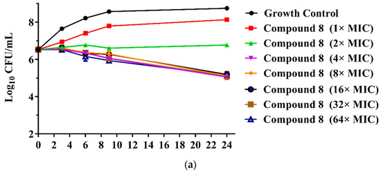 (a) Time-kill curves for MRSA ATCC 43300 with different concentrations of compounds 8; (b) time-kill curves for MRSA ATCC 43300 with different concentrations of compounds 9.