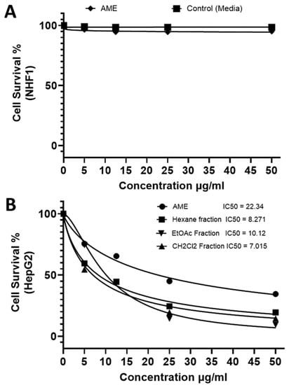 The in vitro testing of the cytotoxic potential of the AME extract and its fractions on HepG2 (human hepatocellular carcinoma cell line) was evaluated. Among the tested fractions, those with the highest potency were CH2Cl2 (IC50 7.015 μg/mL) and hexane, then ethyl acetate fractions (Figure 1B).