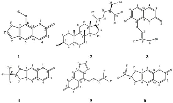 Compounds isolated from the CH2Cl2 fraction of AME. Xanthotoxin (1), β-sitosterol (2), Isoarnottinin (3), Marmesin (4), Imperatorin (5), Ammirin (6).