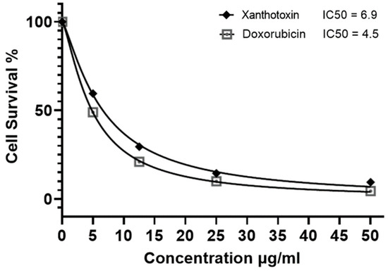 After purification and isolation of the compounds from fraction CH2Cl2, the major compound namely xanthotoxin was assessed against the HepG2 cell line with the same procedures, and it was observed that it exhibited potent cytotoxic activity when compared to the rest of the isolated compounds, with an IC50 of 6.9 μg/mL approaching that of the standard drug doxorubicin (IC50 4.58 ± 0.9 μg/mL), as shown in Figure 3.