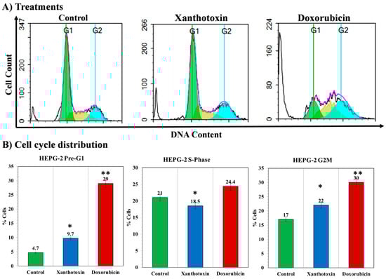 A graphical representation of cell cycle analysis of the HepG2 cells seeded at 2 × 103 cells for 48 h in complete DMEM after different treatments. (A) Flow cytometric histograms representing the cell cycle phases after treatment with xanthotoxin against HepG2 and doxorubicin at their IC50 values compared with control cells. (B) Diagrams of the percentage of pre-G1 phase, S-phase, and G2/M phases for xanthotoxin and doxorubicin in comparison with control cells. All determinations were carried out in triplicates, and values are expressed as means ± SEM. *, ** denote significant difference at p < 0.05 and p < 0.01, respectively.