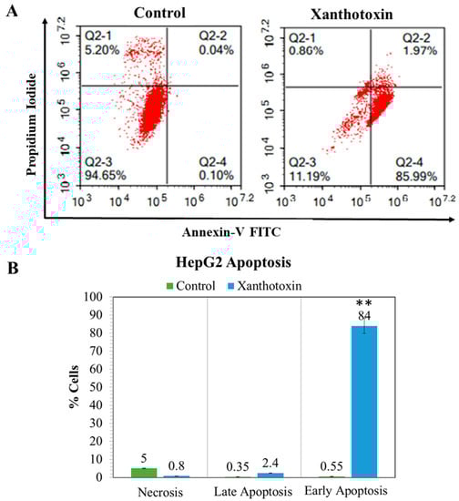 A graphical representation of the programmed cell death of the HepG2 cells after treatment with xanthotoxin. (A) Flow cytometric histograms representing the annexin-V/PI staining of HepG2 seeded at 2 × 103 cells for 48 h in complete DMEM and treated with 6.9 µg/mL of xanthotoxin compared with control cells. (B) Diagrams of the percentage of necrosis and apoptosis for xanthotoxin in comparison with control cells. All analyses were carried out in triplicates, and values are expressed as means ± SEM. ** denotes significant difference at p < 0.01.