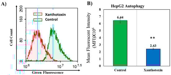 It has been reported recently that autophagy induces pro-survival signals that confer protection to cancer. Molecules inhibiting autophagy are important for effective targeting of cancer cells []. To assess the effect of xanthotoxin on autophagy, HepG2 cells were cultured with 6.9 µg/mL concentration of xanthotoxin for 48 h, and acridine orange flow cytometry flux was measured to determine autophagy. We found a significant decrease in autophagic flux (fusion of autophagosomes and autolysosomes) as indicated by lower acridine orange fluorescence (MFI = 2.43 × 106) compared with that of control cells (MFI = 6.44 × 106) (Figure 6). These results suggest that xanthotoxin negatively affected autophagy.