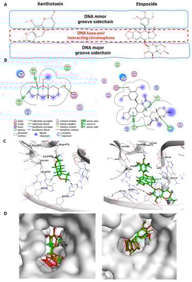 Binding modes of xanthotoxin and etoposide after docking in the active site of topoisomerase II (PDB code: 3QX3). (A) The chemical structure of docked compounds xanthotoxin and etoposide. (B) Two-dimensional (2D) structures of ligand interactions. (C) 3D binding mode illustrating their interactions both with the same amino acid Asp479 inside the human Topo II–DNA complex active site (rendered in stick mode and with hydrogen bonds represented in black dashed lines) and H–pi interactions with DNA nucleotides (in blue dashed lines). (D) 3D positioning and 3D molecular surface diagrams of xanthotoxin and docked etoposide (green sticks) along with the native co-crystalized ligand etoposide (red sticks) inside its active site.