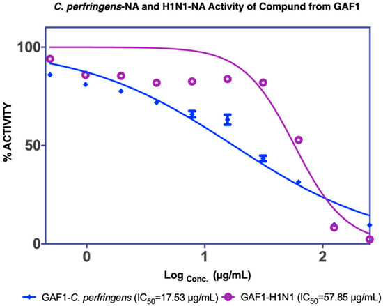 | EtOAC fraction IC50 C. perfringens-NA 26.9 µg/mL IC50 NA-H1N1 48.36 µg/mL | F1 Not active | - | ||