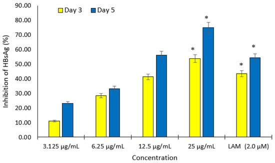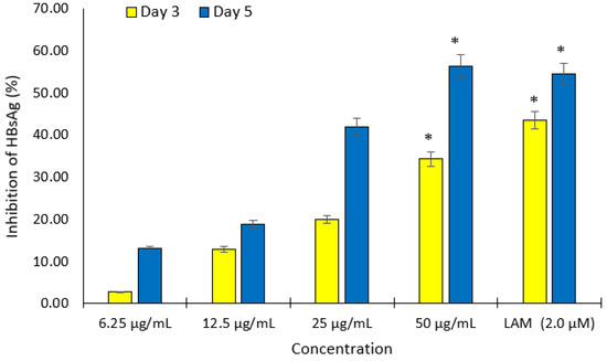 Based on the HBsAg inhibition results, the isolated compounds were subjected to a time-course (day 3 and 5) study on the downregulation of HBV replication by determining the HBeAg expression in the presence of 80 μg/mL of these compounds. The ELISA was performed using a HBeAg/Anti-HBe Elisa Kit (DIASource, Louvain-la-Neuve, Belgium).