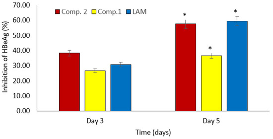 Effect of compounds 1 and 2 on time-dependent downregulation of HBeAg expression in HepG2.2.15 culture. The antigen expression in the culture medium was measured using an ELISA. Lamivudine (2.0 μM) was used as the positive control. Data are presented as the mean ± standard error of the mean, * p < 0.001, day 5 vs. day 3.