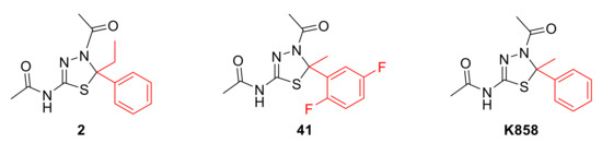 Chemical structures of Eg5 inhibitors 2 and 41 and their parent compound K858. In red, chemical modifications in position 5 of the thiadiazoline core are highlighted.