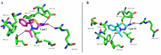 The computational analysis confirmed that both the compounds fit the binding site with a similar pose of K858 (see Figure 2C and Figure 3) and establish a complex hydrogen-bonding network, although with different residues. Derivatives 2 and 41 interact with the phenol moiety of Tyr211 through the acetyl function on the thiadiazoline ring, while two additional hydrogen bonds are formed by the carbonyl group and the nitrogen atom in C2 with the guanidino tail of Arg221 and the carboxylic function of Glu116, respectively. Meanwhile, K858 interacts in the same fashion with Tyr211, while its nitrogen in C2 forms hydrogen bondings with Arg221 and Leu214. As regards the hydrophobic contacts, although placed into the same site with good superposition, the small changes in their chemical structures seem to highlight a different residue interaction network. PLIP analysis indicates that the compounds generate hydrophobic interactions with Trp127, Ile136, Tyr211, and Leu214. Moreover, K858 establishes hydrophobic contacts with Ala133, Pro137, and Leu160 (Figure 2C), while compound 2 with Arg119, Pro137, and Ala218 (Figure 3A). Instead, compound 41 can form a hydrophobic interaction with Arg119 and, also, a halogen bond with Asp130 through the fluorine atom on the phenyl ring in meta position with respect to the thiadiazoline ring (Figure 3B).
