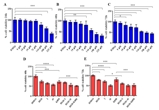 MTT test on AGS cell line treated with increasing doses of HSD (from 9 to 225 μM) for 24, 48, and 72 h (A–C, respectively). *** p < 0.0001; ** p < 0.001; * p < 0.01. MTT test on AGS cells treated with HSD (180 μM), 2 (1 μM), 41 (5 μM), K858 (1 μM), and a combination of HSD with each Eg5 inhibitor for 48 and 72 h (D–E, respectively). **** p < 0.0005, *** 0.005 < p < 0.001, * p < 0.05. Metabolic activity was normalized to control cells treated with DMSO (0.5% as final concentration). DMSO: control vehicle. Data shown represent the mean ± SD of three independent experiments.