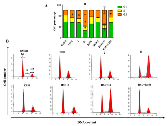 In order to explore the cause of AGS cells death, provoked by 2, 41, and K858, alone or in combination with HSD, a cell cycle analysis after 48 h of treatment was carried out (Figure 5A).